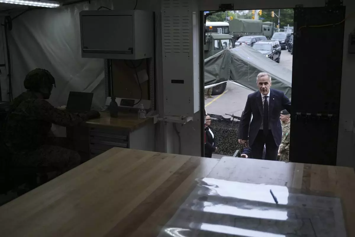 Canada Prime Minister Mark Carney steps into a command post as he visits Fort York Armoury in Toronto, Canada, before making an announcement on Monday, June 9, 2025. (Chris Young/The Canadian Press via AP)