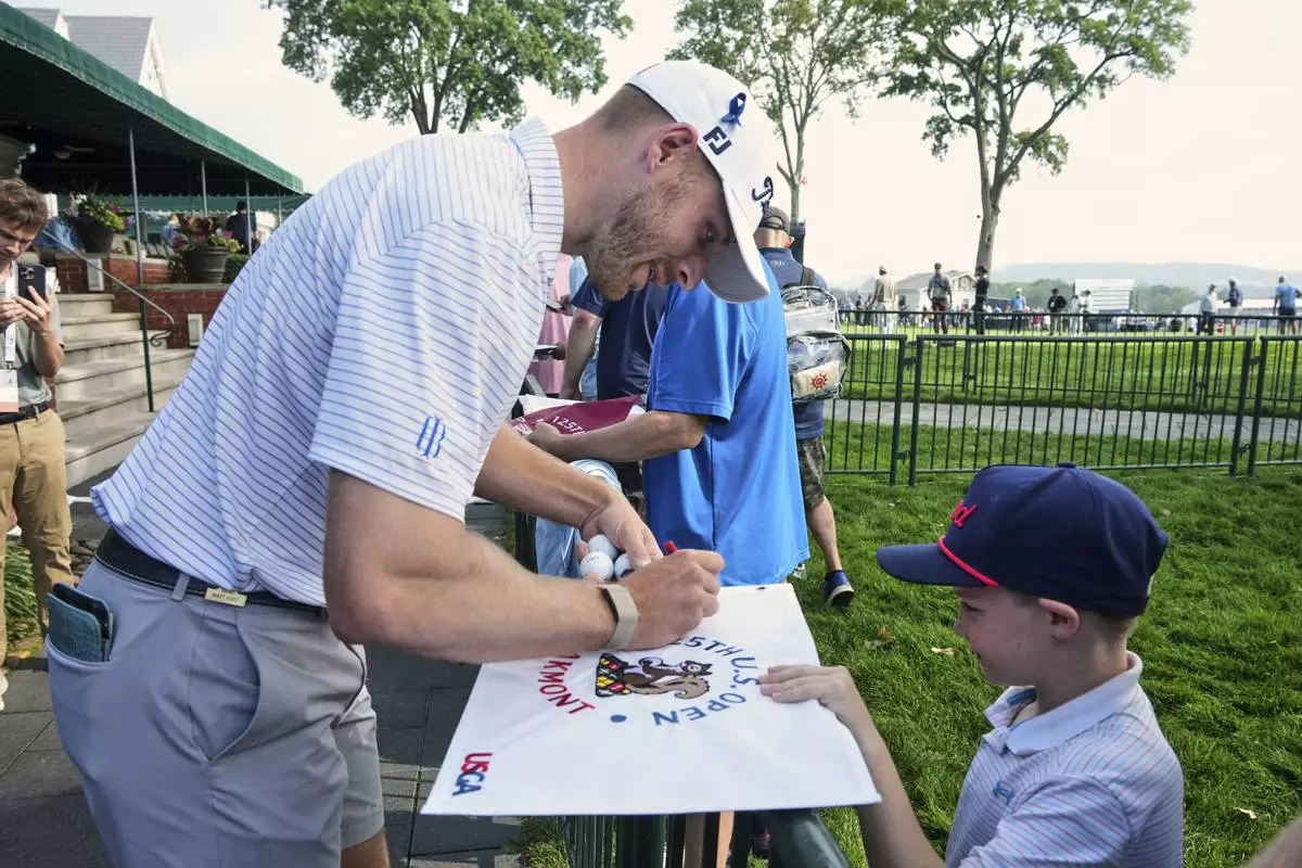 Matt Vogt, right, signs autographs for fans as he makes his way to the first tee for a practice round for the 2025 US Open golf championship at Oakmont Country Club in Oakmont, Pa. Monday, June 9, 2025. (AP Photo/Gene J. Puskar)