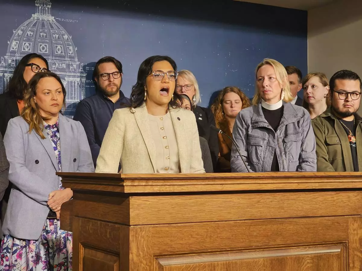 Democratic Rep. María Isa Pérez-Vega, of St. Paul, speaks at a news conference at the Minnesota State Capitol in St. Paul on Monday, June 9, 2025, against legislation that would exclude undocumented adult immigrants from a state-run health care program for the working poor. (AP Photo/Steve Karnowski)
