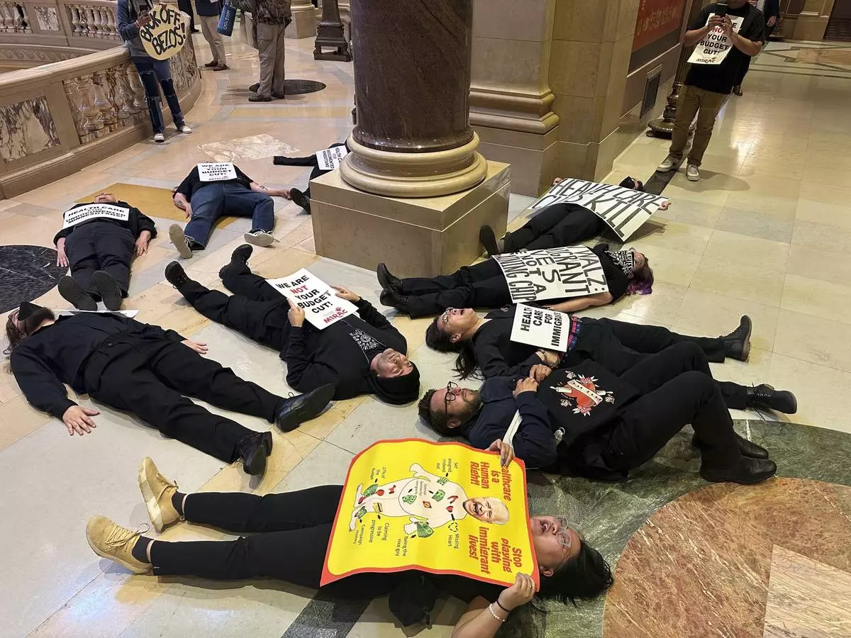 Immigrant rights activists protest outside the Minnesota House chamber at the State Capitol in St. Paul on Monday, June 9, 2025, against legislation that would exclude undocumented adult immigrants from a state-run health care program for the working poor. (AP Photo/Steve Karnowski)