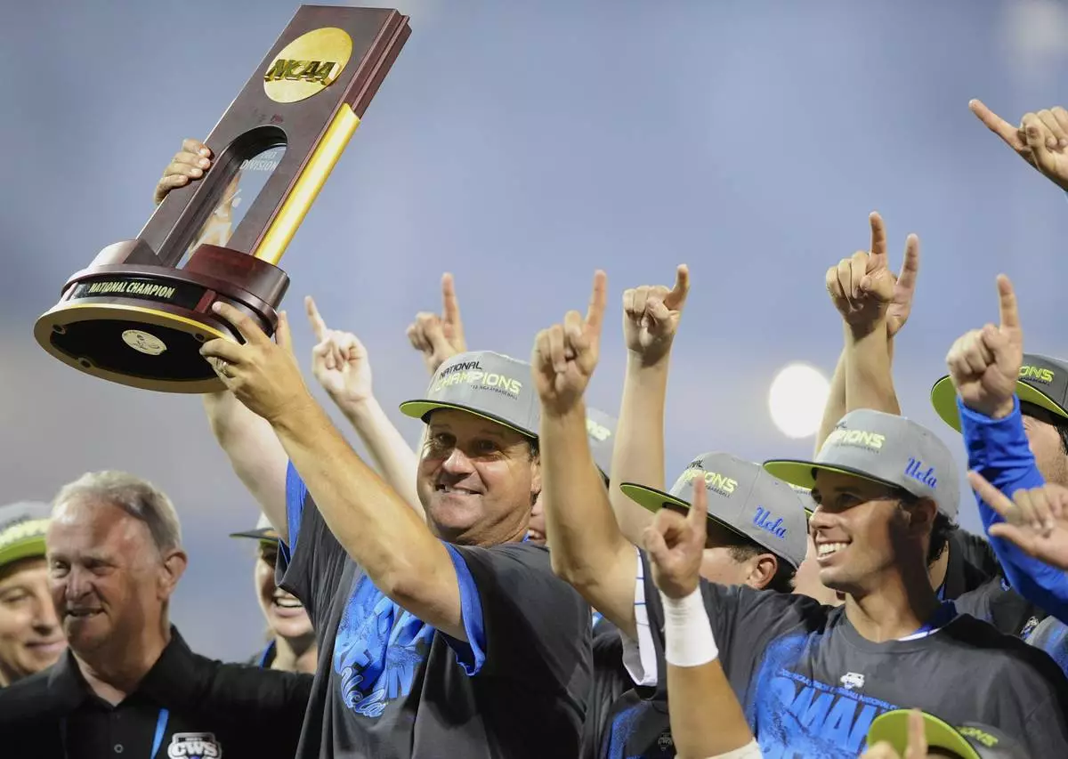 FILE - UCLA coach John Savage is surrounded by players as he hoists the NCAA College World Series trophy, June 25, 2013, in Omaha, Neb. (AP Photo/Eric Francis, File)