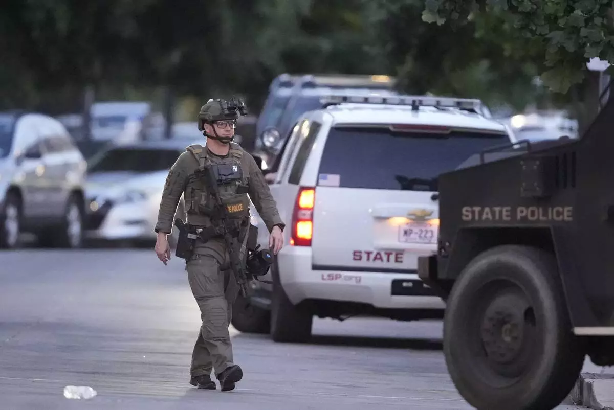 FILE - A Louisiana state police SWAT member works the scene on Iberville Street as police pursue a fugitive that escaped from a New Orleans jail, Tuesday, May 20, 2025, in New Orleans. (AP Photo/Gerald Herbert, File)