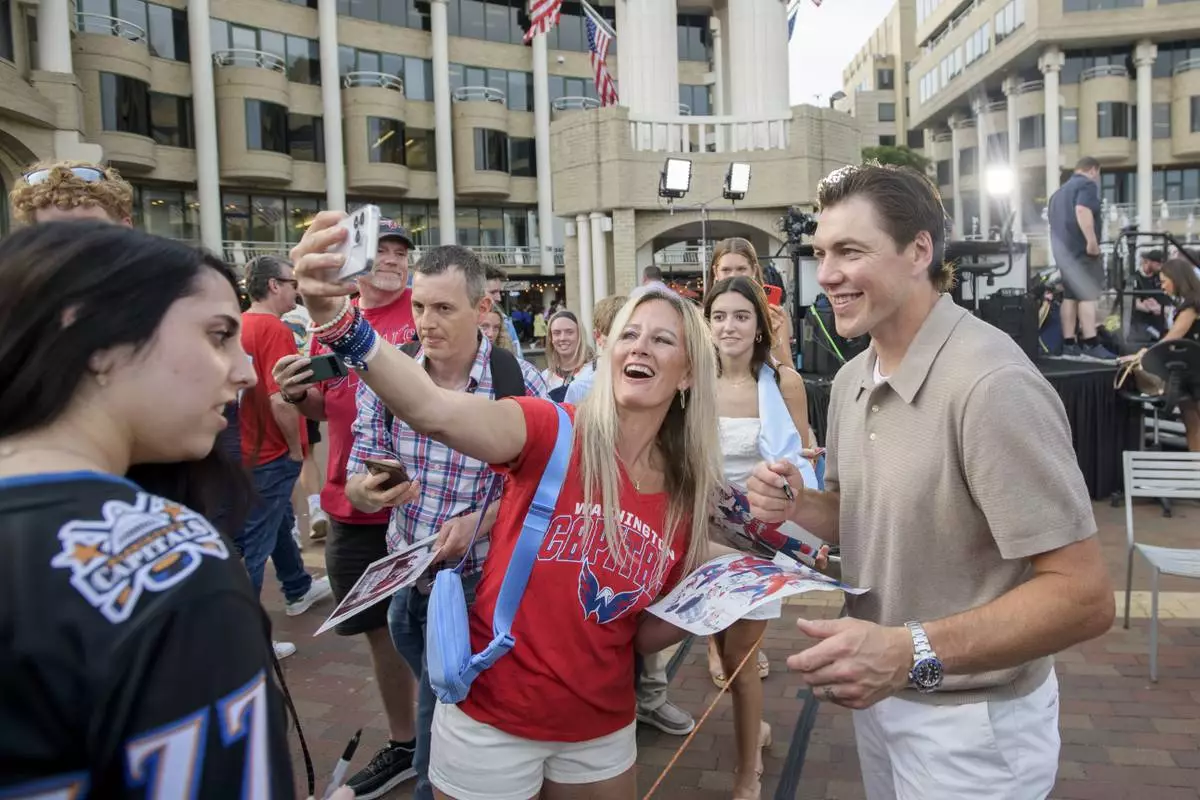 Washington Capitals forward T.J. Oshie, right, poses for a selfie with a fan after announcing his retirement from the NHL at Washington Harbour, Monday, June 9, 2025, in Washington. (AP Photo/Rod Lamkey, Jr.)