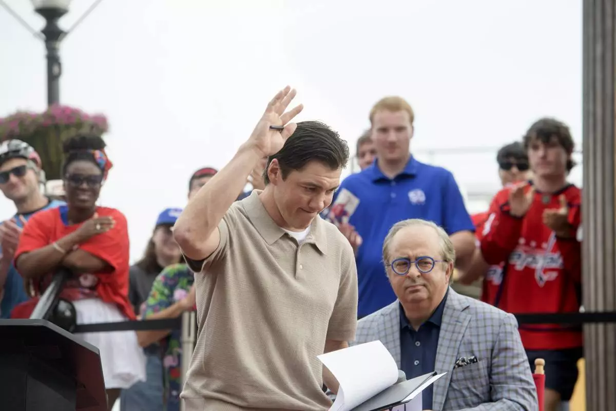 Washington Capitals forward T.J. Oshie acknowledges the crowd at Washington Harbour as he announces his retirement from the NHL, Monday, June 9, 2025, in Washington. (AP Photo/Rod Lamkey, Jr.)