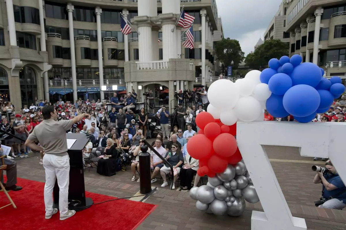 Washington Capitals forward T.J. Oshie speaks to the crowd at Washington Harbour to announce his retirement from the NHL, Monday, June 9, 2025, in Washington. (AP Photo/Rod Lamkey, Jr.)