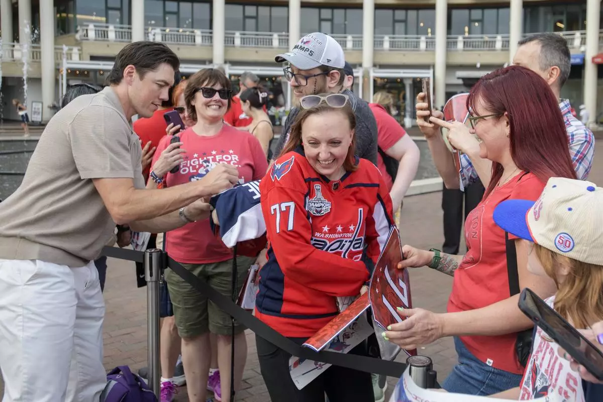 Washington Capitals forward T.J. Oshie, left, signs autographs for fans after announcing his retirement from the NHL at Washington Harbour, Monday, June 9, 2025, in Washington. (AP Photo/Rod Lamkey, Jr.)
