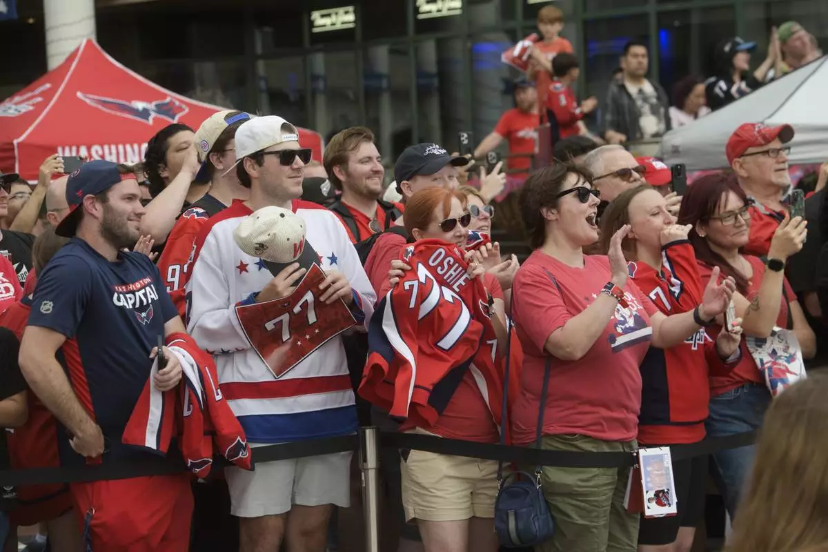 Washington Capitals fans cheer as they await for the arrival of Washington Capitals forward T.J. Oshie, prior to his announcement of his retirement from the NHL, at Washington Harbour, Monday, June 9, 2025, in Washington. (AP Photo/Rod Lamkey, Jr.)
