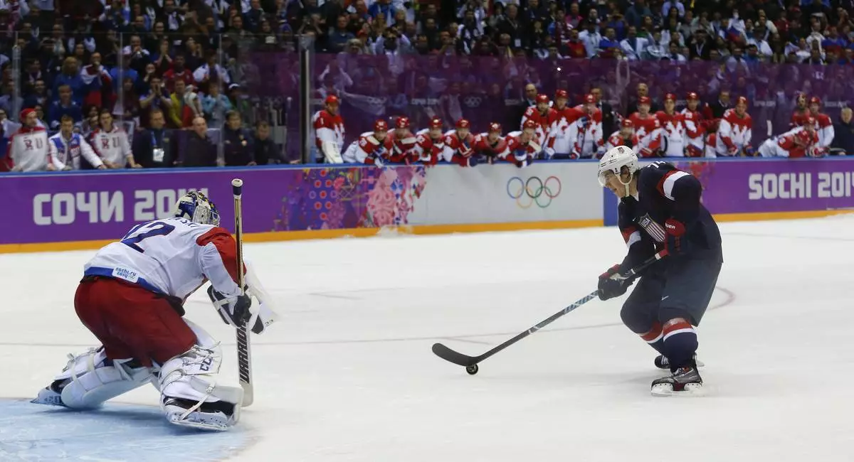 FILE - USA forward T.J. Oshie prepares to take a shot against Russia goaltender Sergei Bobrovski in an overtime shootout during a men's ice hockey game at the 2014 Winter Olympics, Saturday, Feb. 15, 2014, in Sochi, Russia. Oshie scored the winning goal and the USA won 3-2. (AP Photo/Julio Cortez, File)