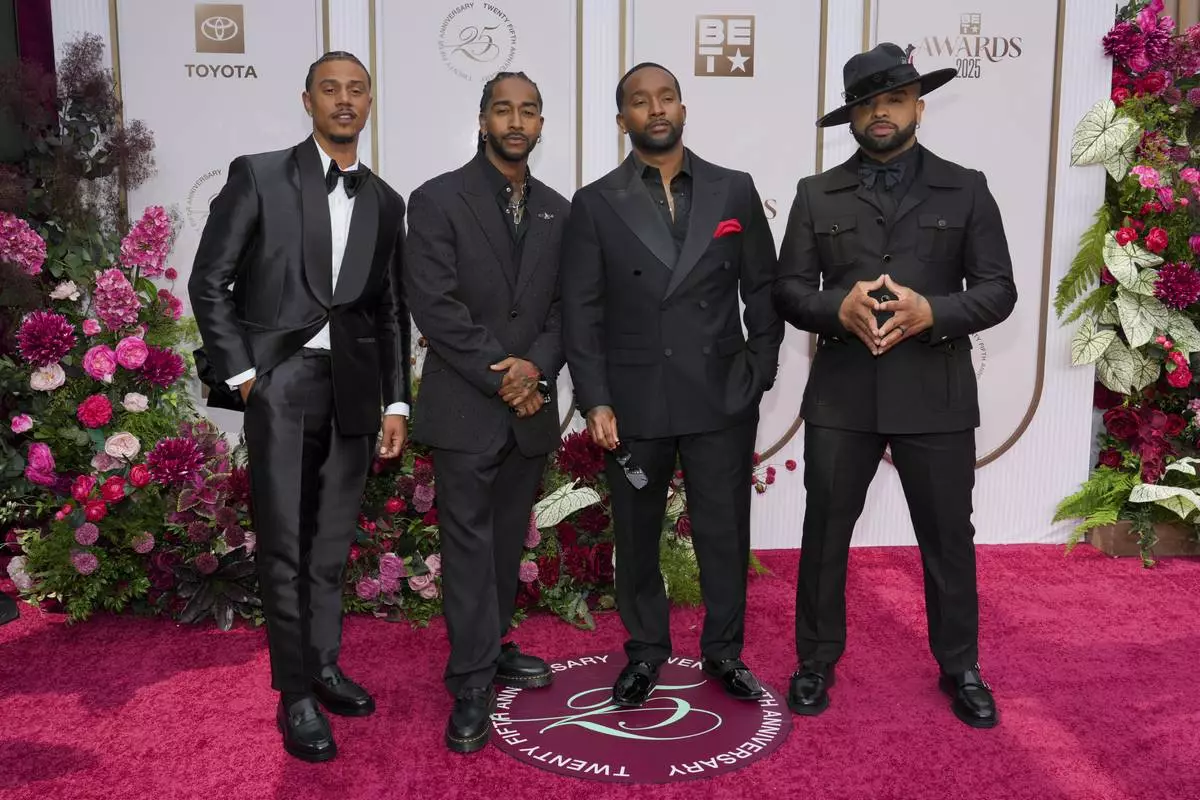 Lil' Fizz, from left, Omarion, J-Boog, and Raz-B of B2K arrive at the BET Awards on Monday, June 9, 2025, at the Peacock Theater in Los Angeles. (Photo by Jordan Strauss/Invision/AP)
