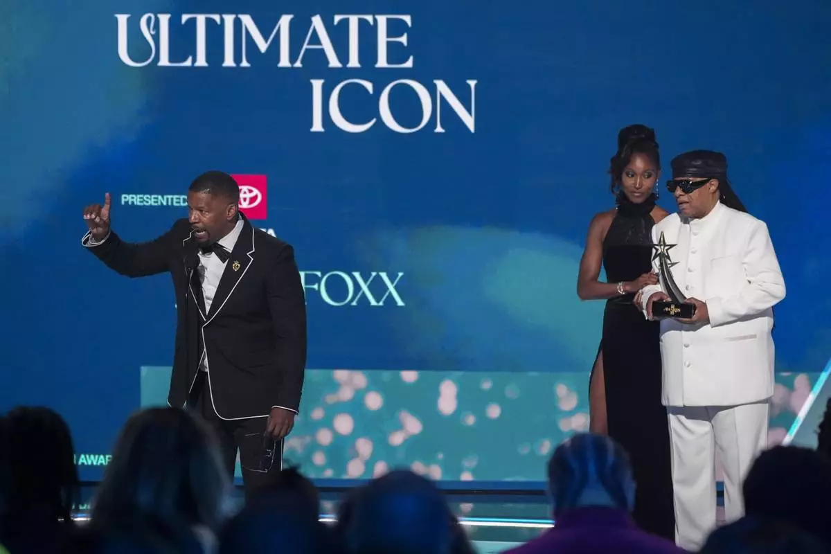 Jamie Foxx accepts the ultimate icon award during the BET Awards on Monday, June 9, 2025, at the Peacock Theater in Los Angeles. Stevie Wonder looks on from right.(AP Photo/Chris Pizzello)