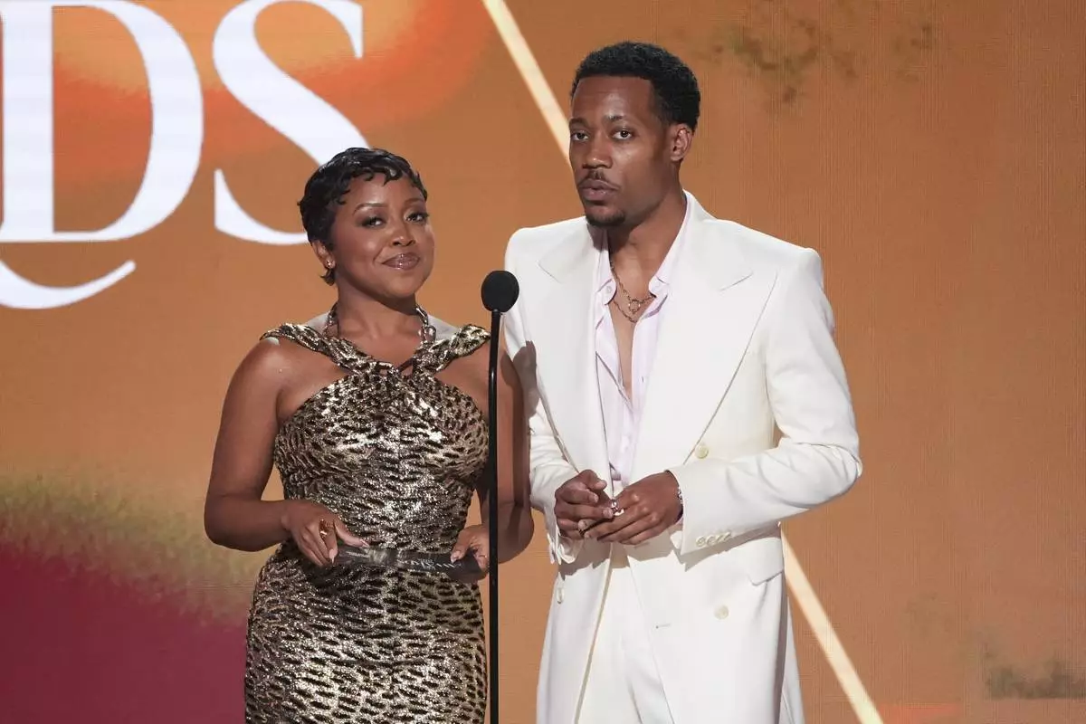 Quinta Brunson, left, and Tyler James Williams present the award for best female hip hop artist during the BET Awards on Monday, June 9, 2025, at the Peacock Theater in Los Angeles. (AP Photo/Chris Pizzello)