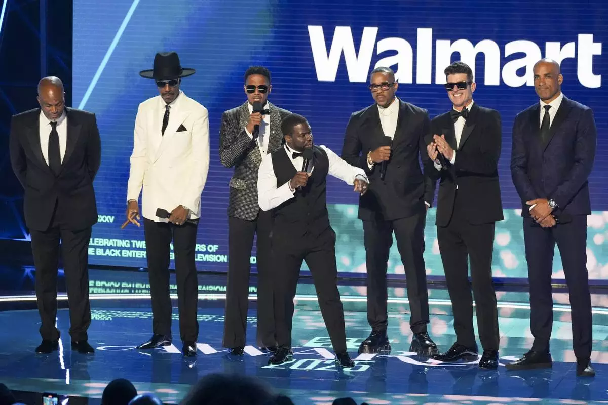 Dondre Whitfield, from left, JB Smoove, Nick Cannon, Kevin Hart, Duane Martin, Robin Thicke, and Boris Kodjoe speak onstage during the BET Awards on Monday, June 9, 2025, at the Peacock Theater in Los Angeles. (AP Photo/Chris Pizzello)
