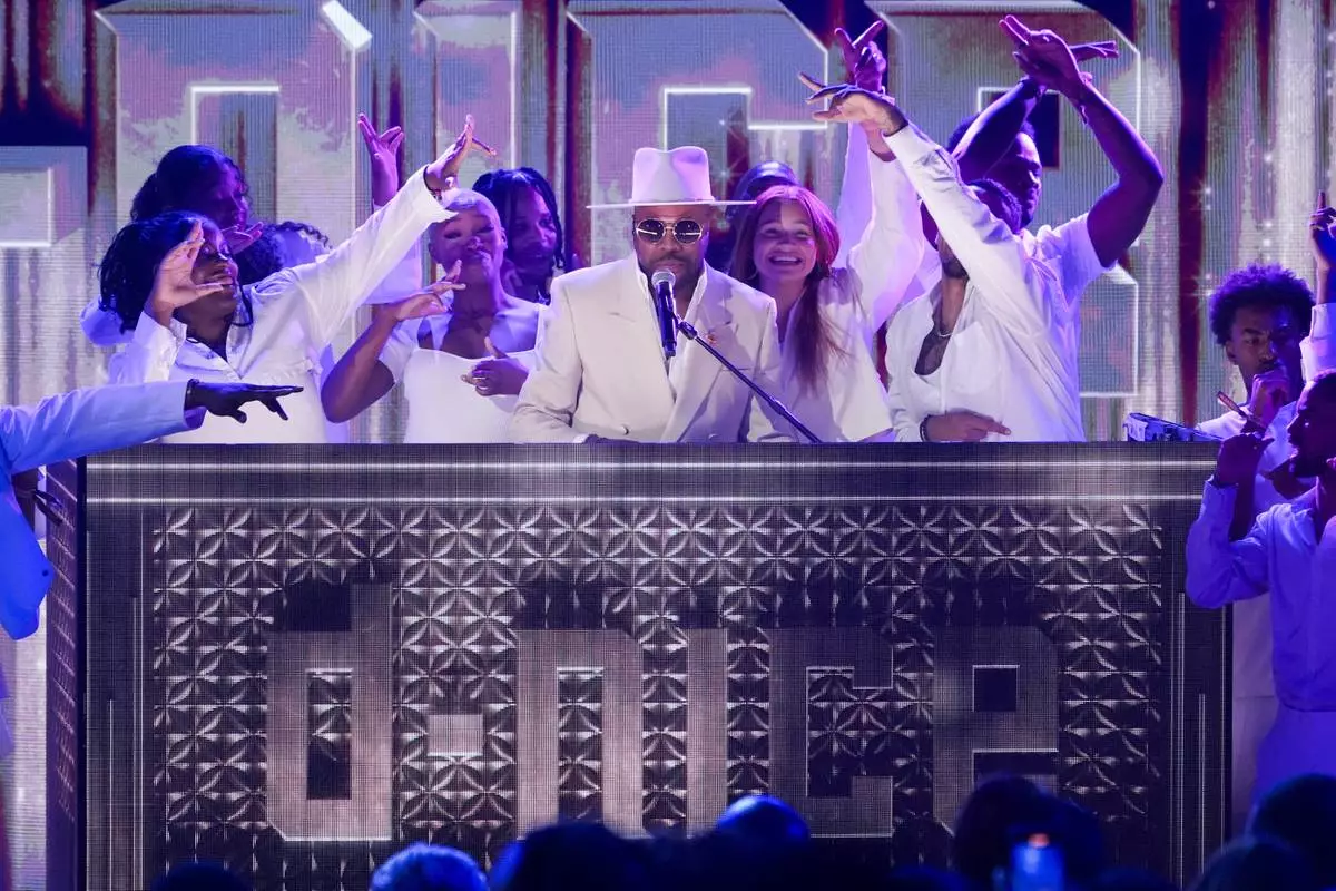 D-Nice, center, speaks during the BET Awards on Monday, June 9, 2025, at the Peacock Theater in Los Angeles. (AP Photo/Chris Pizzello)