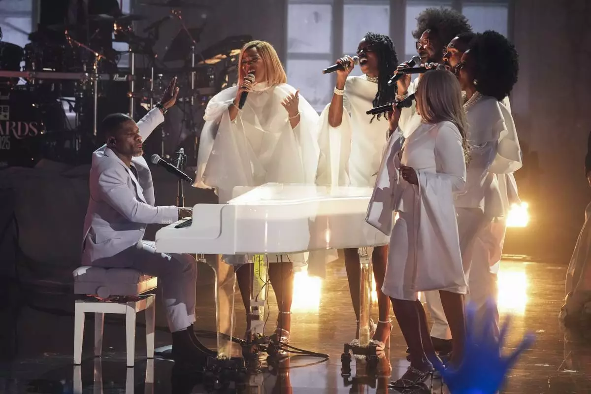 Kirk Franklin, far left, performs during the BET Awards on Monday, June 9, 2025, at the Peacock Theater in Los Angeles. (AP Photo/Chris Pizzello)
