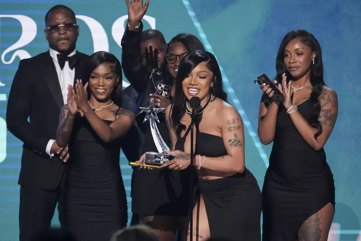 GloRilla, center, accepts the award for Dr. BobbyJones best gospel/inspirational award for "Rain Down on Me" during the BET Awards on Monday, June 9, 2025, at the Peacock Theater in Los Angeles. (AP Photo/Chris Pizzello)