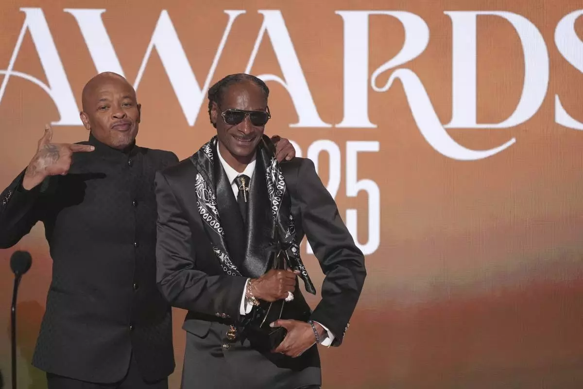 Snoop Dogg, right, accepts the ultimate icon award during the BET Awards on Monday, June 9, 2025, at the Peacock Theater in Los Angeles. Dr. Dre look on from left,(AP Photo/Chris Pizzello)