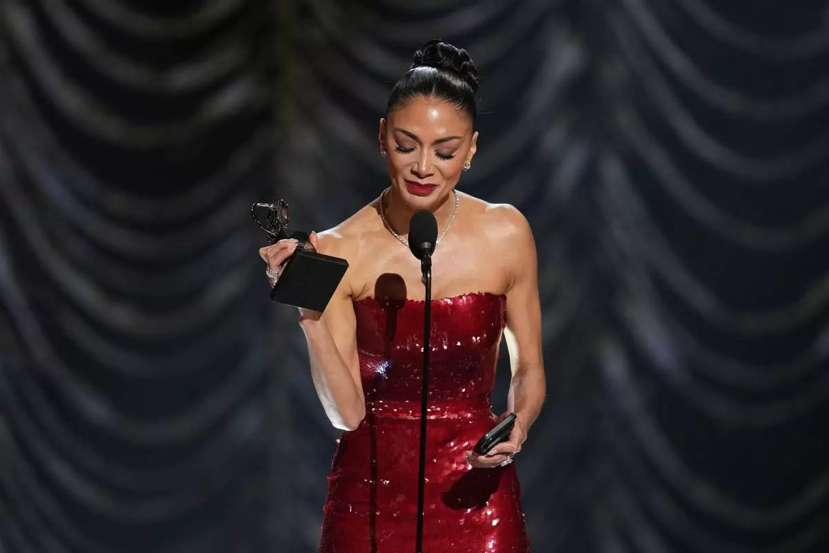 Nicole Scherzinger accepts the award for best performance by an actress in a leading role in a musical for "Sunset Blvd." during the 78th Tony Awards on Sunday, June 8, 2025, at Radio City Music Hall in New York. (Photo by Charles Sykes/Invision/AP)