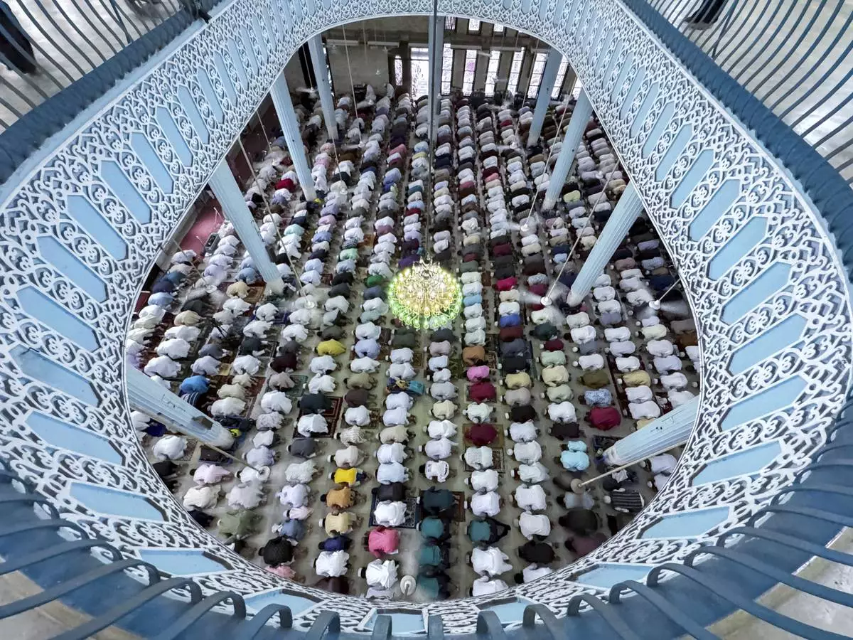Devotees pray during the Muslim festival of Eid al-Adha at Baitul Mukarram National Mosque in Dhaka, Bangladesh, Saturday, June 7, 2025. (AP Photo/Mahmud Hossain Opu)