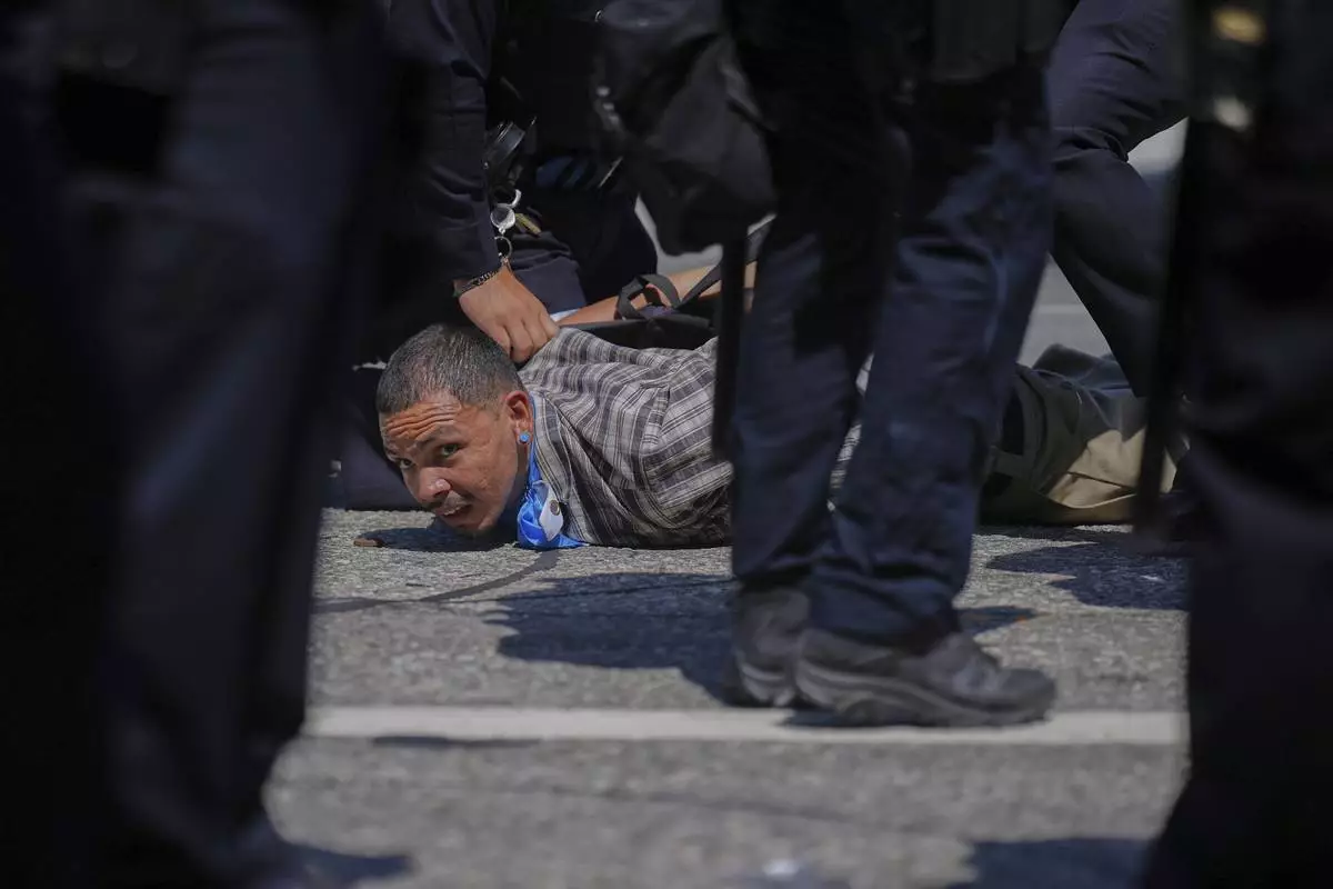 A protester is detained by police in downtown Los Angeles, Sunday, June 8, 2025, following last night's immigration raid protest. (AP Photo/Eric Thayer)