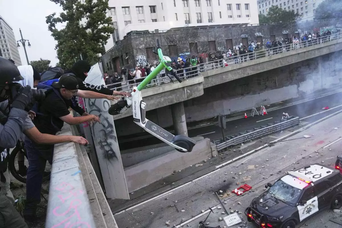 A protester throws a scooter at a police vehical near the metropolitan detention center of downtown Los Angeles, Sunday, June 8, 2025, following last night's immigration raid protest. (AP Photo/Jae C. Hong)
