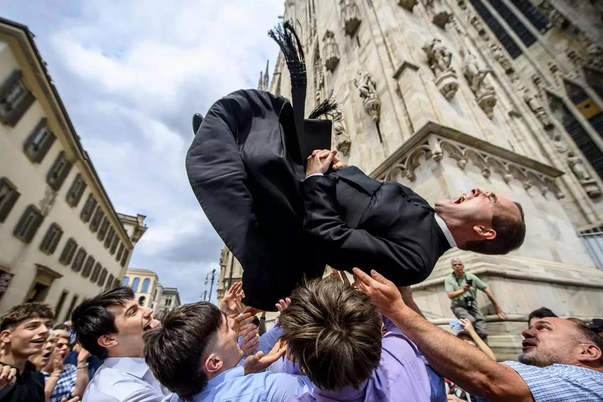 A newly-ordained priest is thrown in the air during celebrations after the service in the Duomo gothic cathedral for the ordination of 11 new priests of the Ambrosian Church, in Milan, Italy, Saturday, June 7, 2025 (Claudio Furlan/LaPresse via AP)