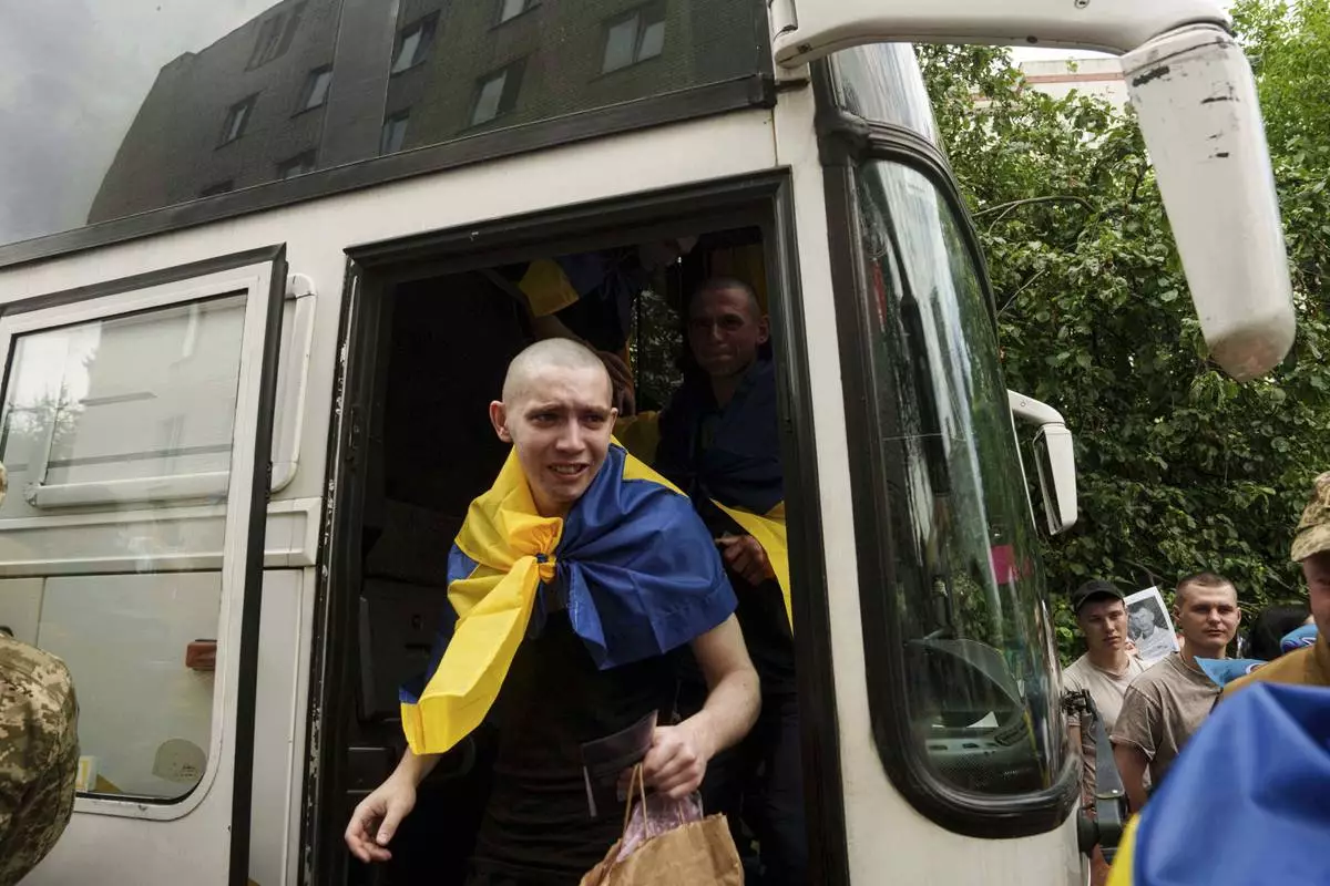 An Ukrainian soldier reacts after returning from captivity after a POWs exchange between Russia and Ukraine, in Chernyhiv region, Ukraine, Monday, June 9, 2025. (AP Photo/Evgeniy Maloletka)