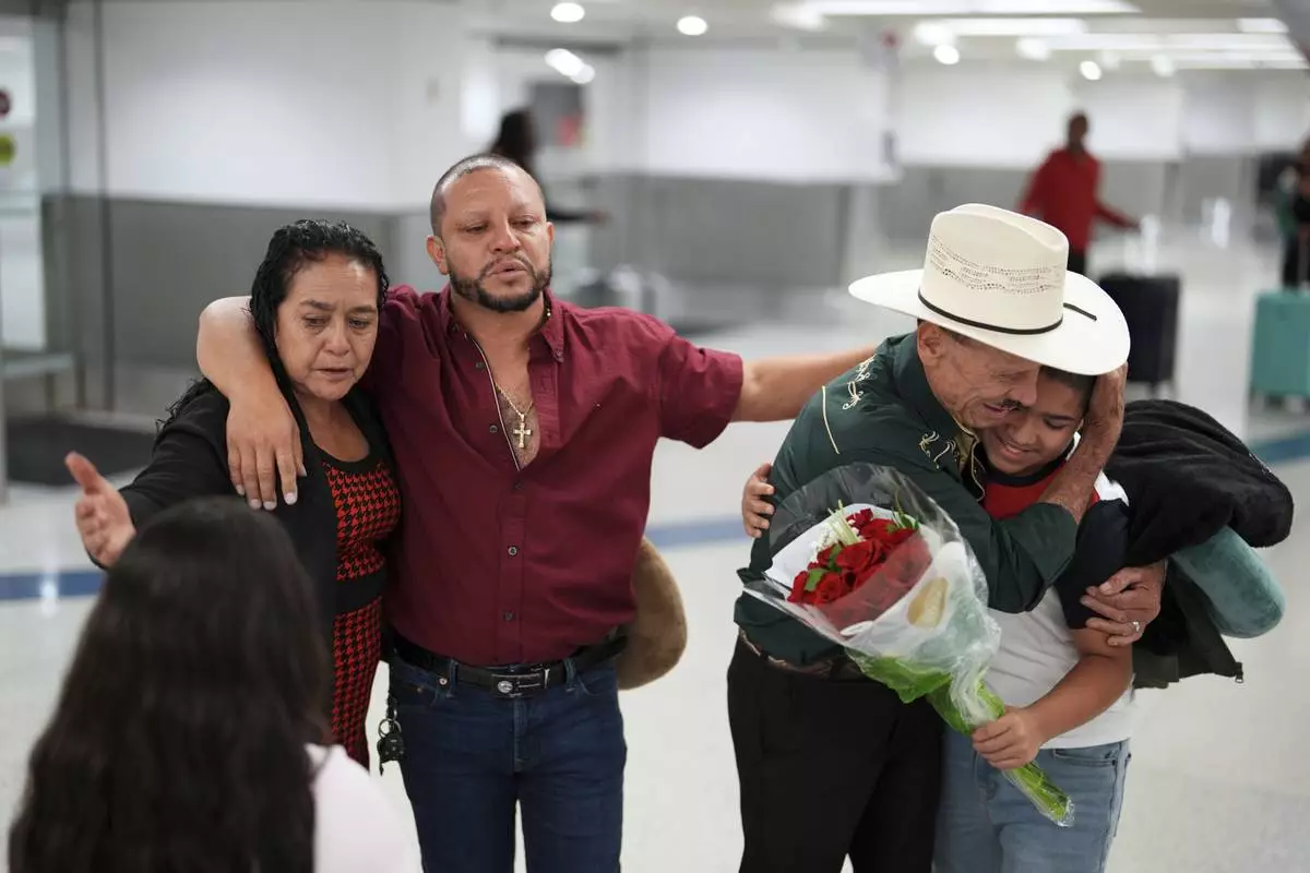 Alfredo de Jesus Reynoso Gonzalez, 73, second right, and wife Vicenta Aguilar, left, greet their son, center, they are seeing for the first time in 22 years, and two grandchildren they were meeting in person for the first time, as they arrive from Guatemala for a visit, at Miami International Airport, Monday, June 9, 2025, in Miami. (AP Photo/Rebecca Blackwell)