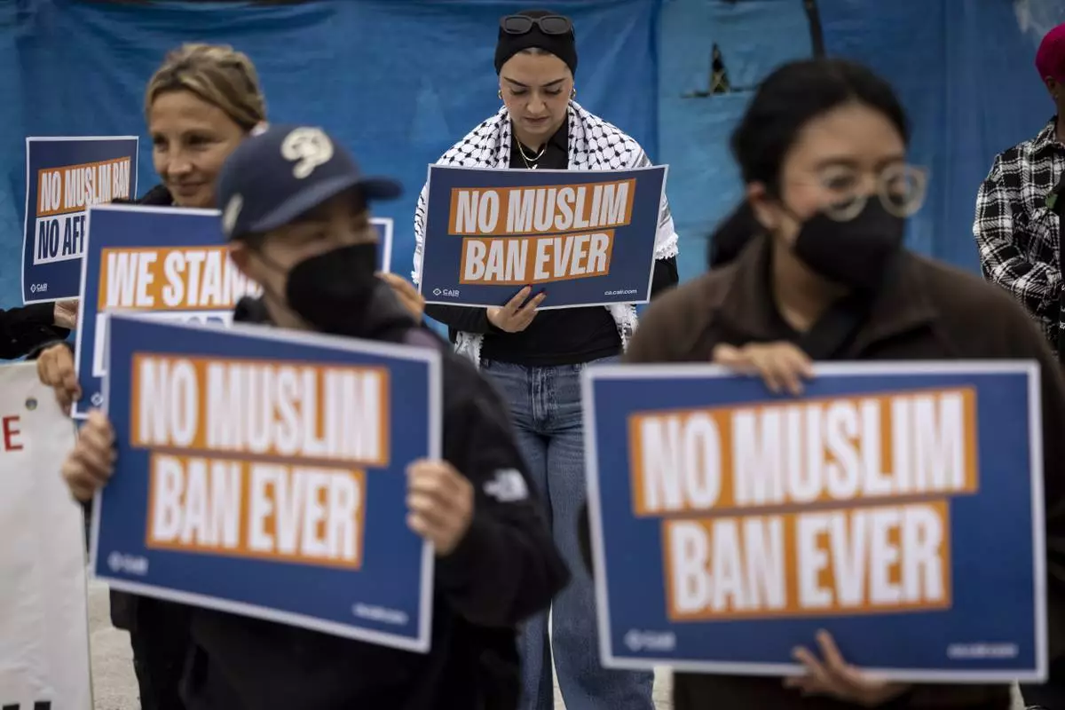 Demonstrators gather during a protest against the new travel ban announced last week by President Donald Trump, at the Tom Bradley International Terminal at Los Angeles International Airport, Monday, June 9, 2025, in Los Angeles. (AP Photo/Etienne Laurent)