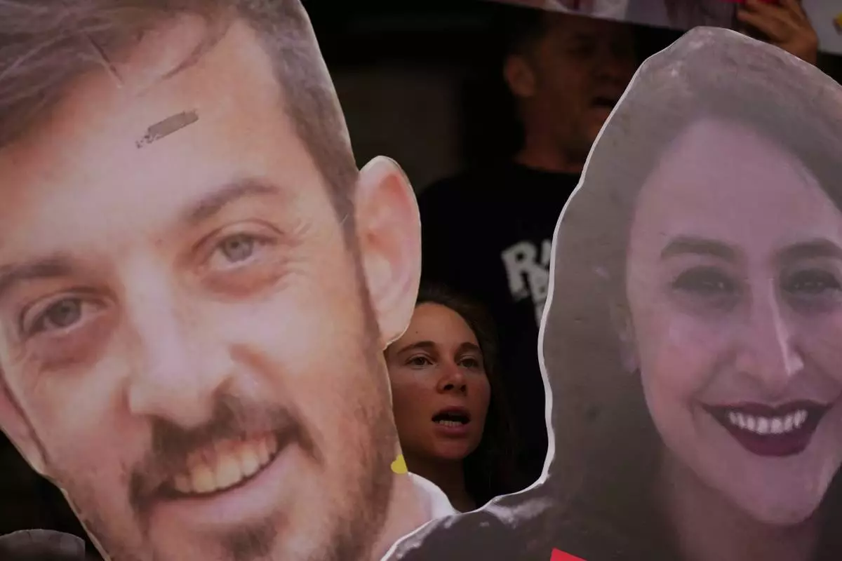 Relatives and supporters of Israeli hostages held by Hamas in Gaza hold photos depicting the faces of Israeli hostages who are being held in the Gaza Strip, during a protest demanding their release from Hamas captivity, in Tel Aviv, Israel, Monday, June 9, 2025. (AP Photo/Ariel Schalit)