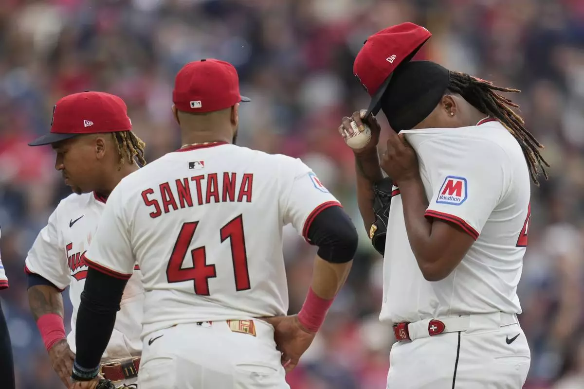 Cleveland Guardians starting pitcher Luis Ortiz, right, wipes his face with his jersey as he waits with teammates Jose Ramirez, left, and Carlos Santana (41) for Carl Willis during a mound meeting in the fifth inning of a baseball game against the Cincinnati Reds in Cleveland, Monday, June 9, 2025. (AP Photo/Sue Ogrocki)