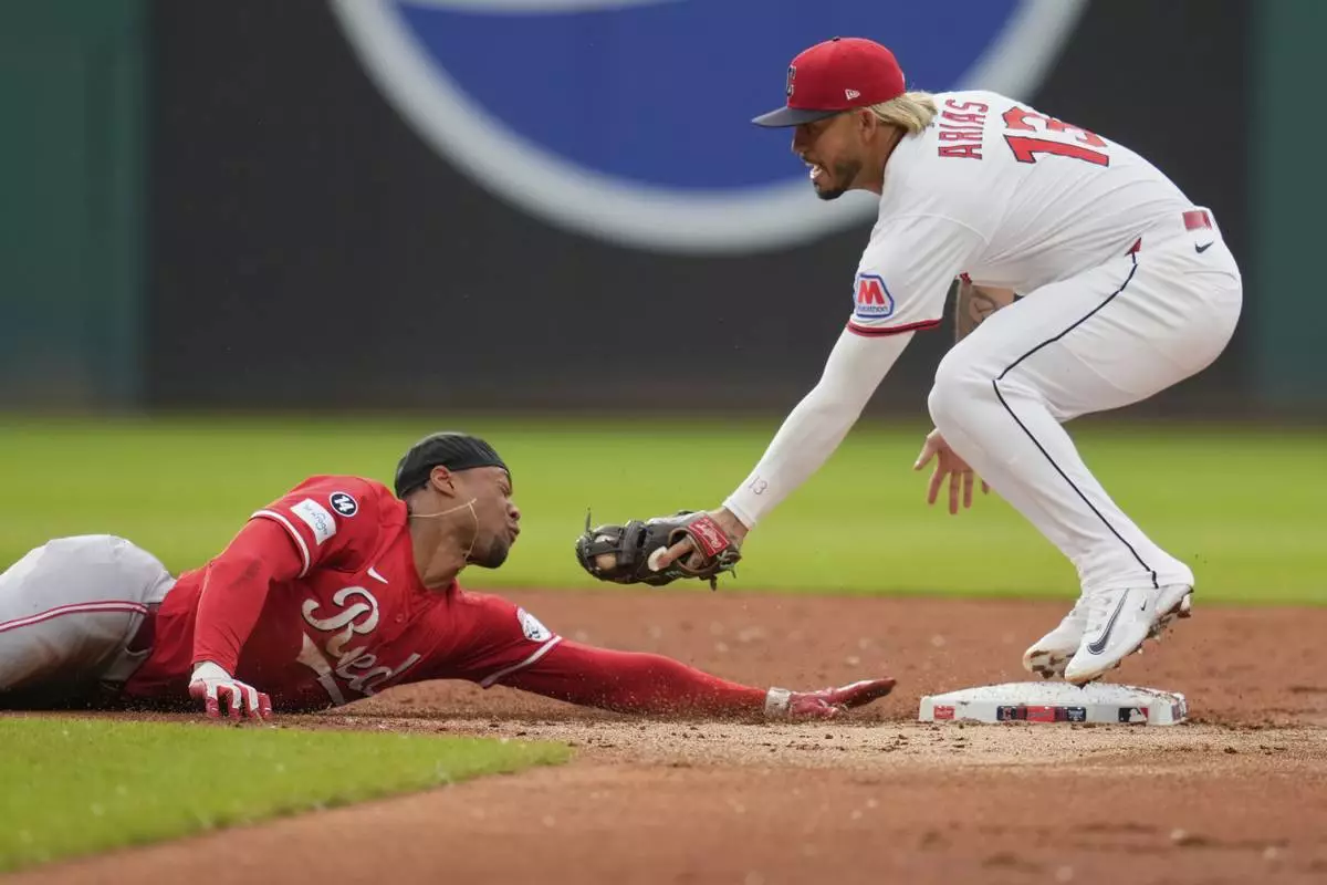 Cincinnati Reds' Will Benson, left, slides safely back to second base as Cleveland Guardians shortstop Gabriel Arias attempts the tag on a pick off attempt in the second inning of a baseball game in Cleveland, Monday, June 9, 2025. (AP Photo/Sue Ogrocki)
