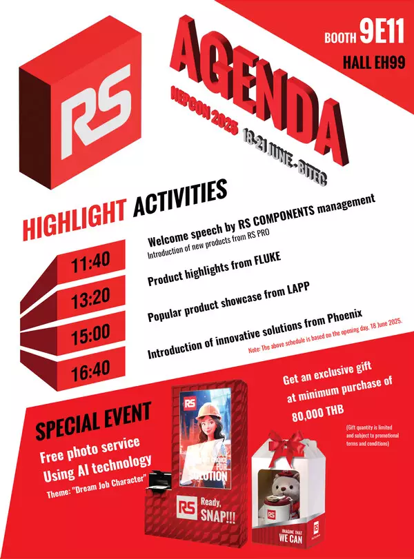 At NEPCON Thailand 2025, RS Group will showcase its comprehensive capabilities to enable manufacturers across industries to embrace digital transformation, aligned with the exhibition's focus on AI and smart semiconductor technologies. Visitors to the RS booth can explore products from RS PRO, the company's trusted private label, offering a wide range of tools, tool storage solutions, and test & measurement equipment.