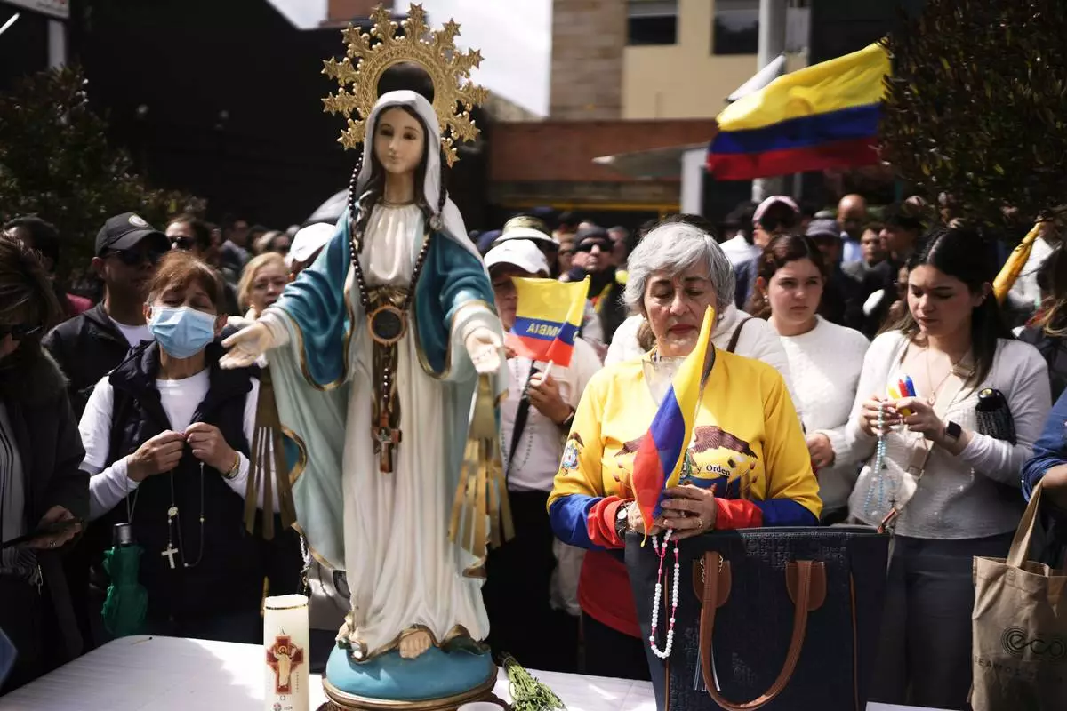 People gather to pray for Colombian Senator Miguel Uribe Turbay's recovery after he was shot at a political rally, in Cali, Colombia, Sunday, June 8, 2025. (AP Photo/Santiago Saldarriaga)