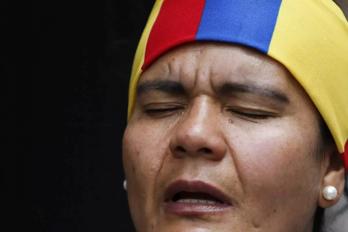 A woman prays outside the clinic where Colombian Senator Miguel Uribe Turbay is being treated after he was shot, in Bogota, Colombia, Sunday, June 8, 2025. (AP Photo/John Vizcaino)