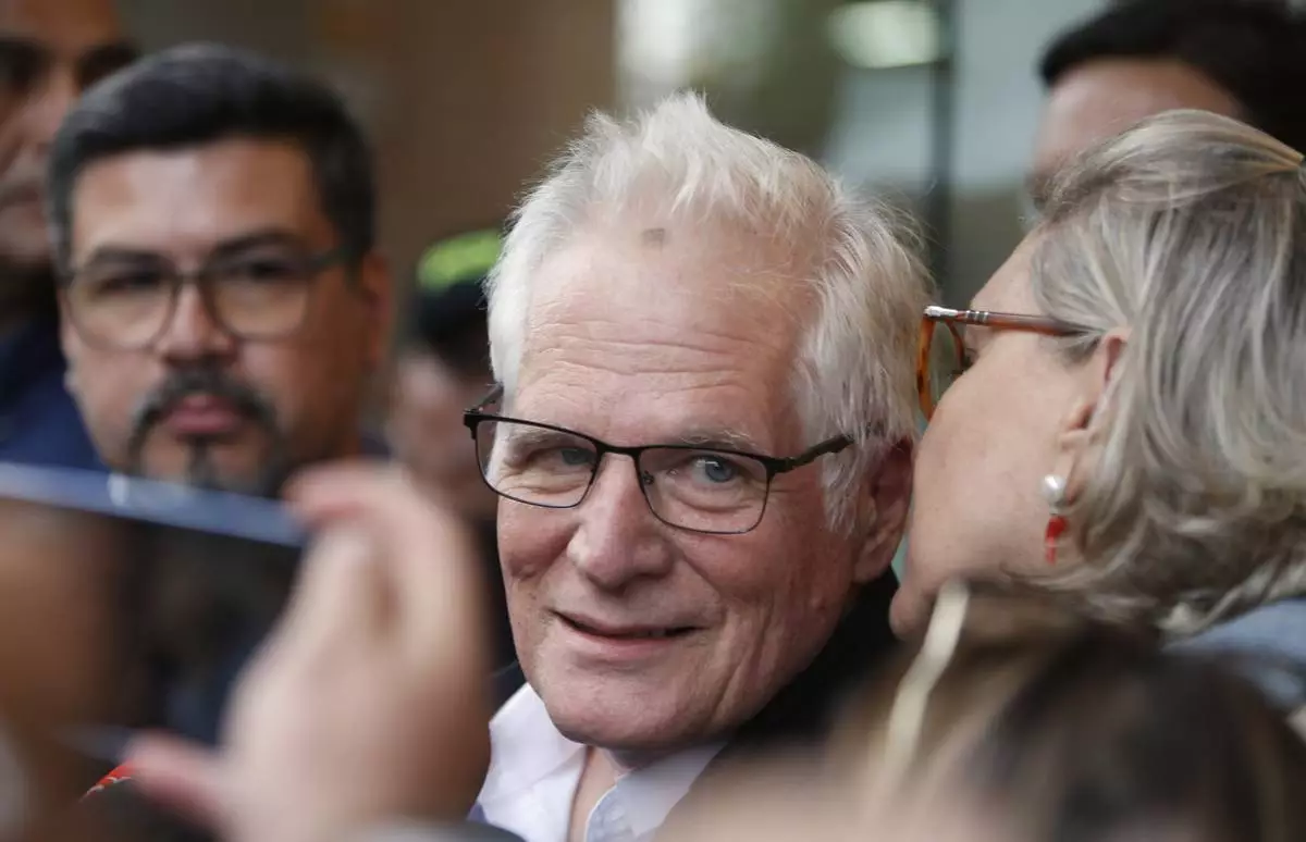Miguel Uribe Londono, the father of Colombian senator and presidential candidate Miguel Uribe Turbay, who was shot during a campaign rally, speaks with the press outside the clinic where Uribe Turbay is being treated, in Bogota, Colombia, Monday, June 9, 2025. (AP Photo/John Vizcaino)