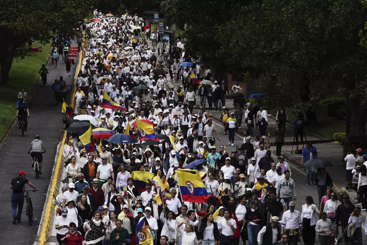 People march to the clinic where Colombian Senator Miguel Uribe Turbay is being treated after he was shot, in Bogota, Colombia, Sunday, June 8, 2025. (AP Photo/Ivan Valencia)