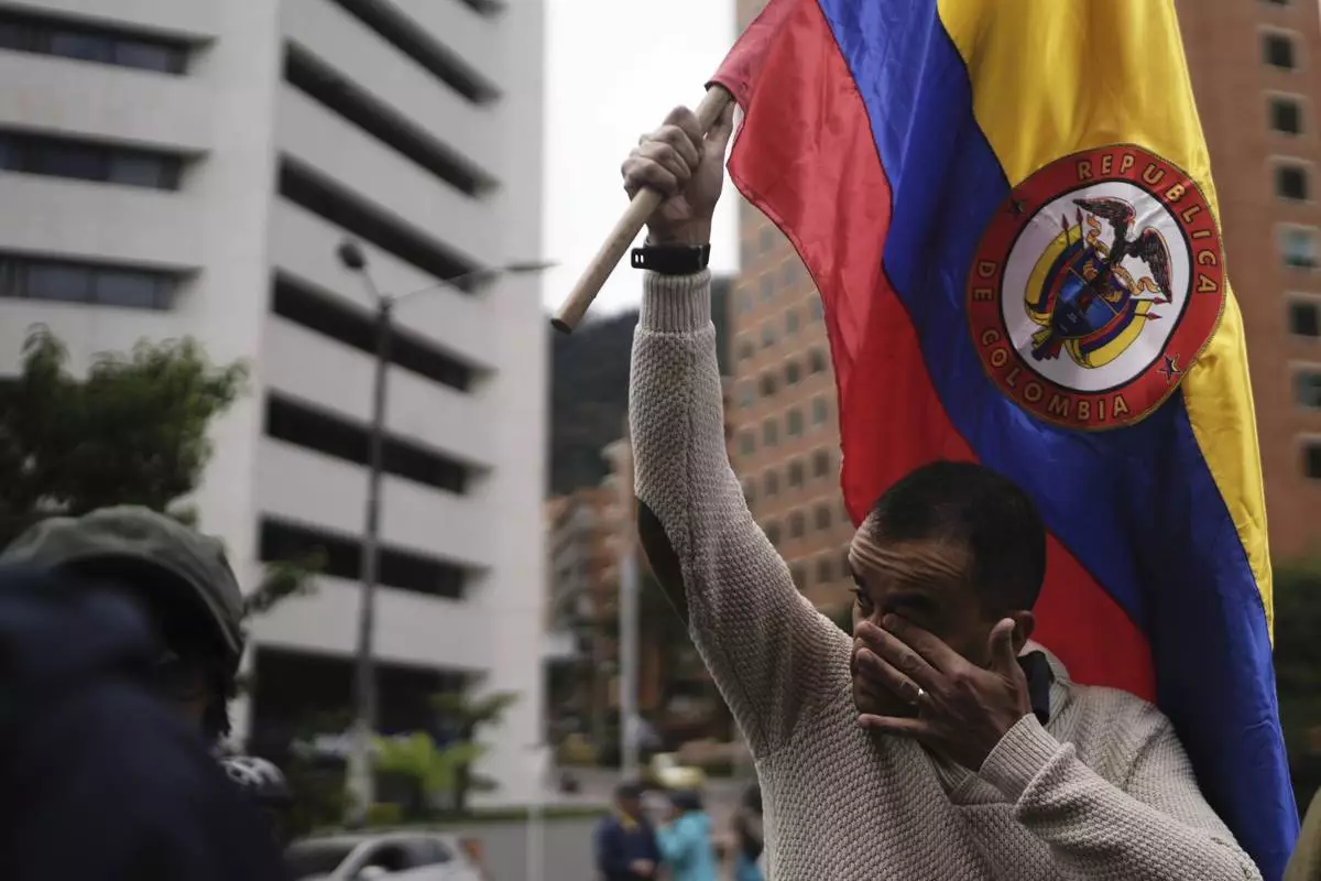 A man holds a Colombian flag as he marches to the clinic where Senator Miguel Uribe Turbay is being treated after an assassination attempt, in Bogota, Colombia, Sunday, June 8, 2025. (AP Photo/Ivan Valencia)