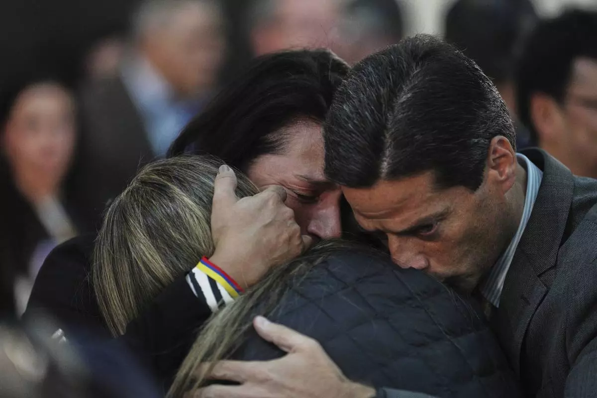 People embrace during a Mass to pray for Sen. Miguel Uribe Turbay's health, after he was shot at a political rally, in Bogota, Colombia, Monday, June 9, 2025. (AP Photo/Ivan Valencia)