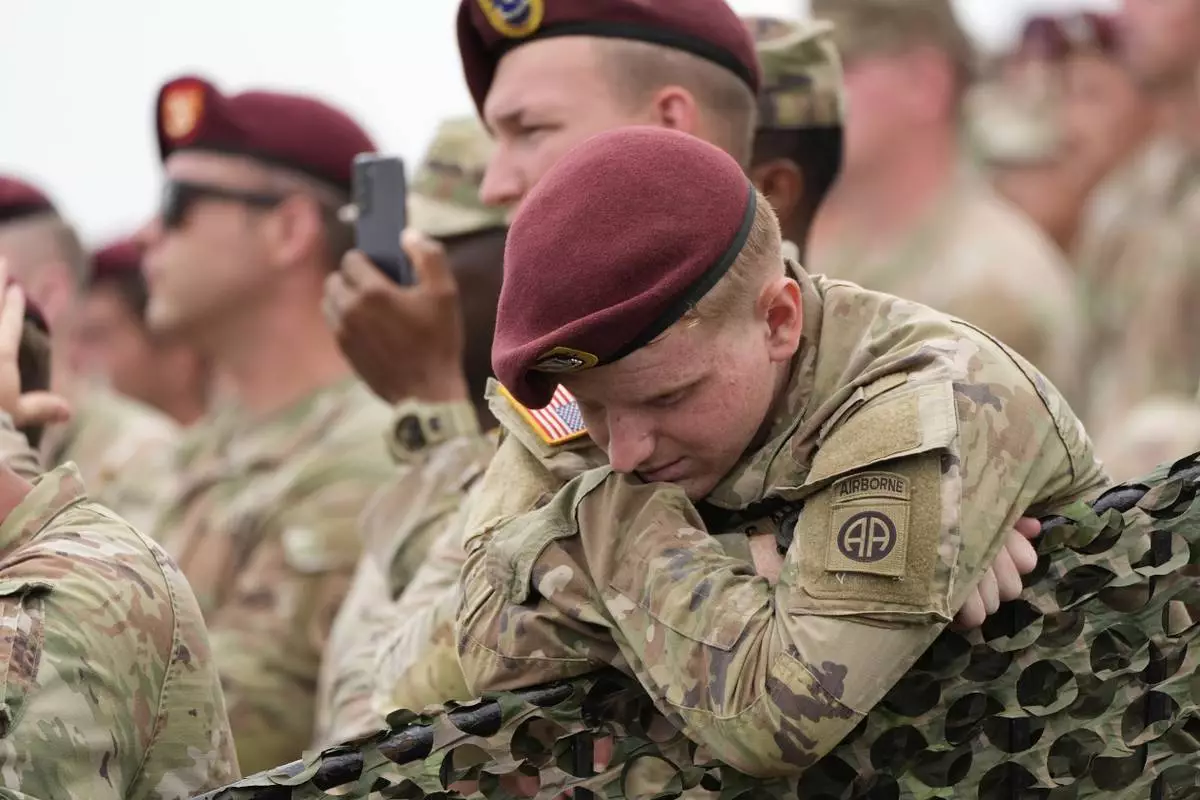 Soldiers at Fort Bragg line up to get into the grounds where later this afternoon President Donald Trump will be speaking in Fayetteville, N.C., Tuesday, June 10, 2025. (AP Photo/Karl DeBlaker)
