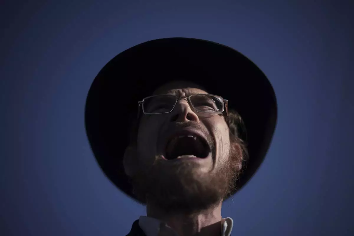 An ultra-Orthodox Jewish man shouts during a protest against army recruitment in Bnei Brak, Israel, Thursday, June 5, 2025. (AP Photo/Leo Correa)