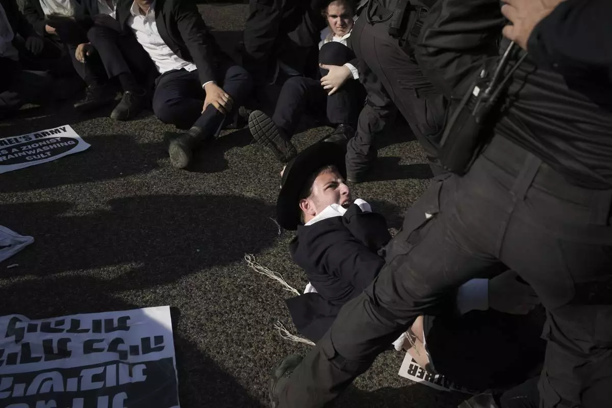 Israeli police officers disperse ultra-Orthodox Jewish men during a protest against army recruitment in Bnei Brak, Israel, Thursday, June 5, 2025. (AP Photo/Leo Correa)