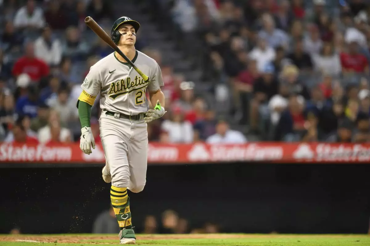 Athletics' Tyler Soderstrom reacts after hitting a ground ball during the seventh inning of a baseball game against the Los Angeles Angels, Monday, June 9, 2025, in Anaheim, Calif. (AP Photo/William Liang)
