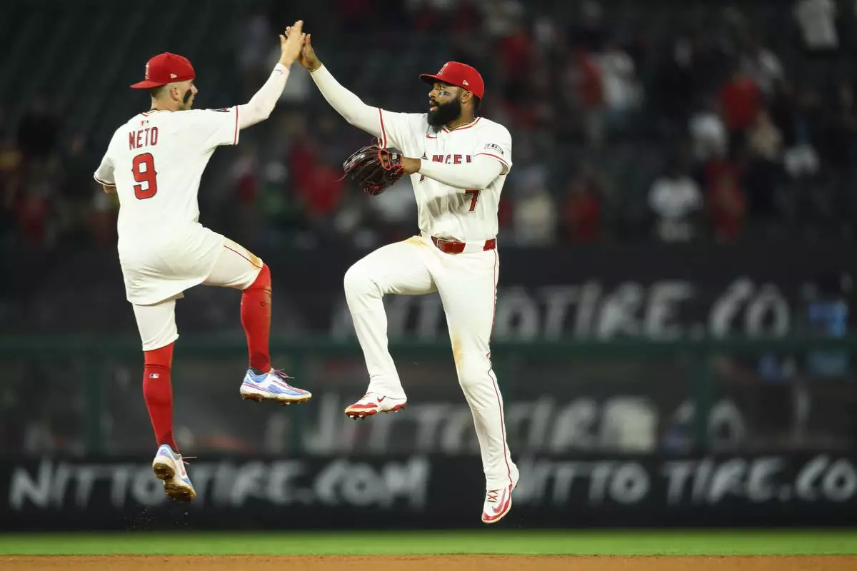 Los Angeles Angels' Jo Adell, right, celebrates with Zach Neto after winning a baseball game against the Athletics, Monday, June 9, 2025, in Anaheim, Calif. (AP Photo/William Liang)