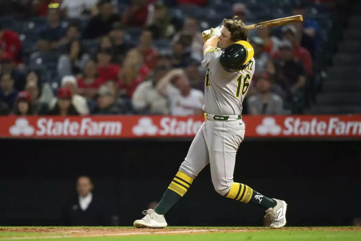 Athletics' Nick Kurtz loses his helmet swinging during the eighth inning of a baseball game against the Los Angeles Angels, Monday, June 9, 2025, in Anaheim, Calif. (AP Photo/William Liang)