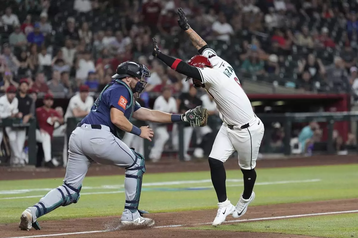 Arizona Diamondbacks' Ildemaro Vargas, right, avoids the tag by Seattle Mariners catcher Cal Raleigh, left, but is ruled out of the baseline for an out during the 10th inning of a baseball game Monday, June 9, 2025, in Phoenix. (AP Photo/Ross D. Franklin)