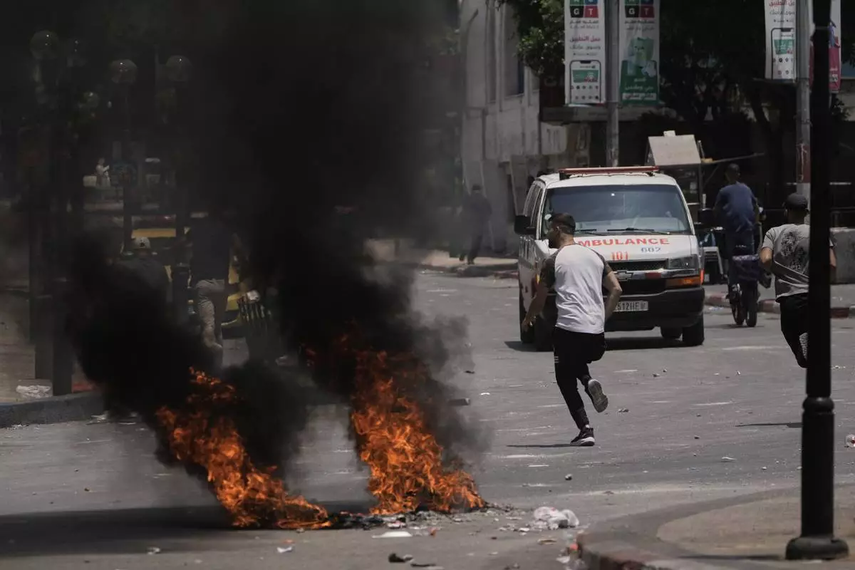Palestinians run past burning tires during clashes with Israeli forces following a military raid in the West Bank city of Nablus, Tuesday, June 10, 2025. (AP Photo/Majdi Mohammed)