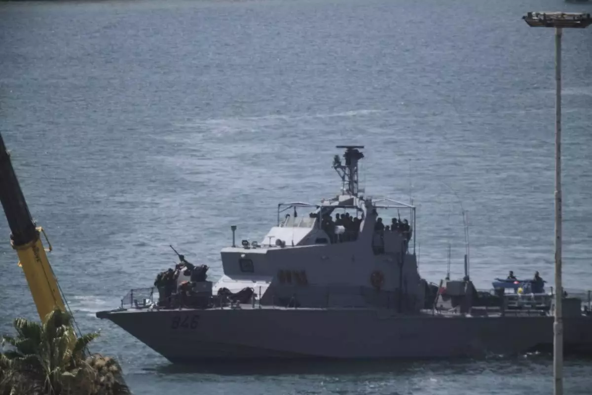 The Gaza-bound aid boat, Madleen, under escort of Israeli naval forces enters to Ashdod Port in southern Israel after being seized by Israeli forces, Monday, June 9, 2025. (AP Photo/Leo Correa)