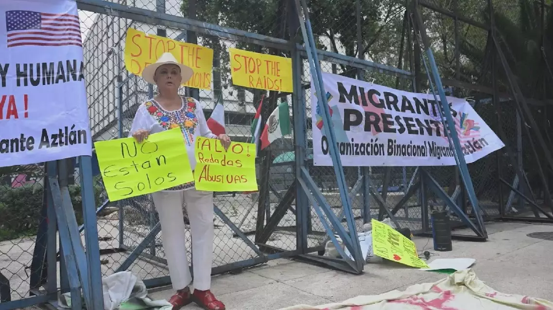 Demonstrators gathered outside the U.S. Embassy in Mexico City on Monday to express support for the Mexican community in the United States following recent mass roundups of migrants and resulting protests in Los Angeles, California.