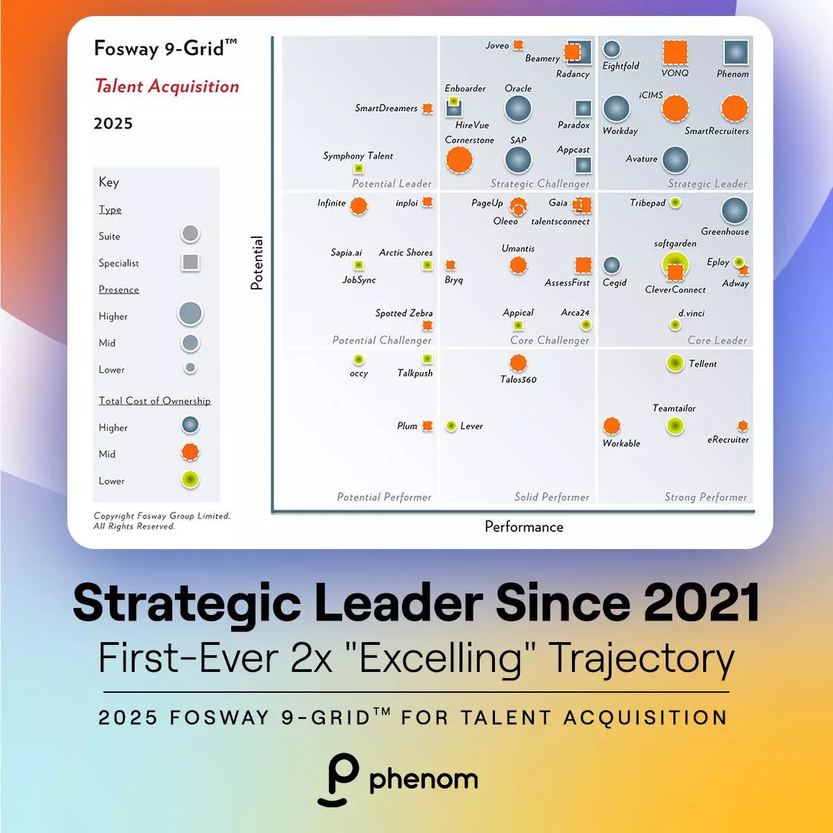 Phenom has been named a Strategic Leader in Fosway 9-Grid™ for Talent Acquisition for the fifth consecutive year, and is the first vendor ever to achieve the ‘Excelling’ trajectory rating two years in a row.