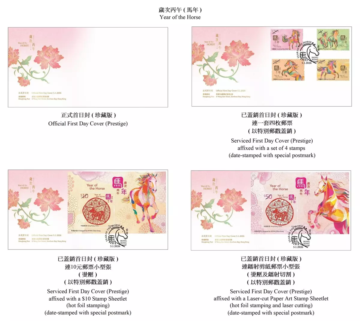 Official first day covers for "Year of the Horse" and official Lunar New Year animals souvenir covers for the "Gold and Silver Stamp Sheetlet on Lunar New Year Animals - Snake/Horse" will be on sale at all post offices and on Hongkong Post's online shopping platform ShopThruPost (shopthrupost.hongkongpost.hk) from tomorrow (December 16). Prestige version of the aforesaid covers and the newly designed 2026 Souvenir Cover will also be available at all philatelic offices and ShopThruPost on the same day.